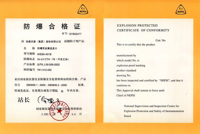防爆雙金屬溫度計領取了由國家級儀器儀表防爆安全監(jiān)督檢驗站出具的防爆合格證1
