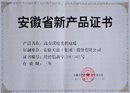 安徽省新產(chǎn)品證書-高交聯(lián)度光伏電纜
