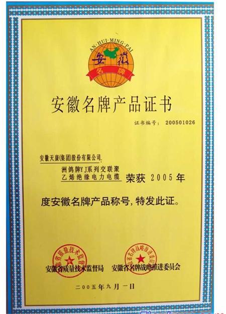 電纜獲安徽?。玻埃埃的甓让飘a(chǎn)品稱號