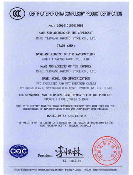 聚氯乙烯絕緣聚氯乙烯護套電纜被中國質(zhì)量認證中心評為中國國家強制生產(chǎn)產(chǎn)品認證證書英文版